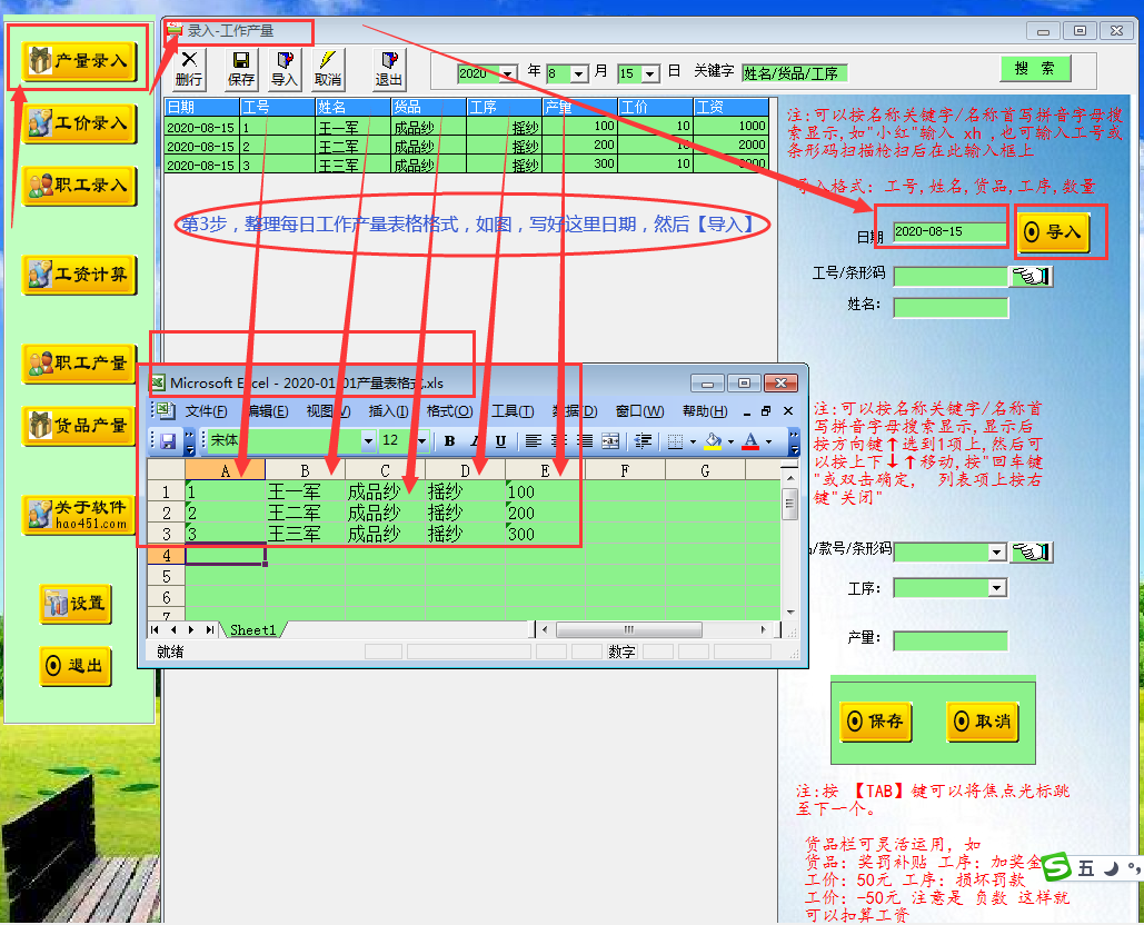 1.【工价录入】整理好 表格 格式 ,生产型就输入货品名,与工序名,